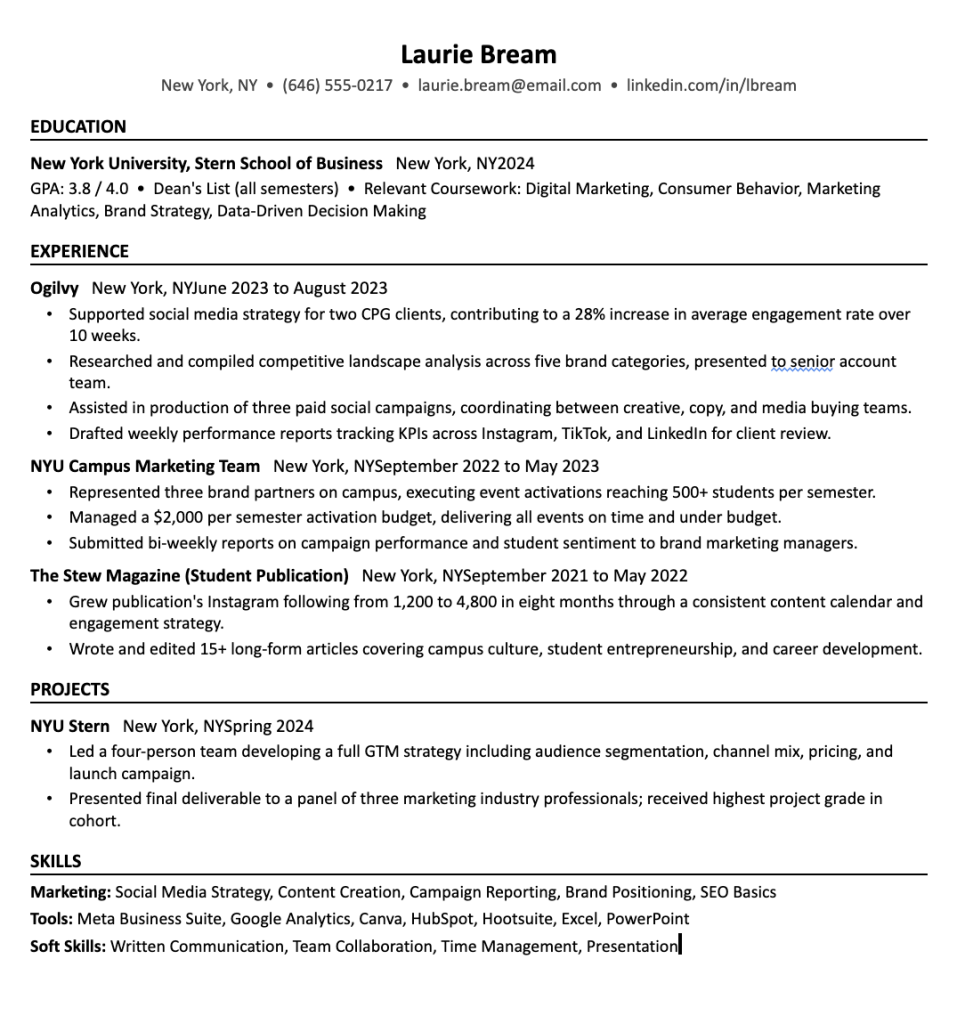 When you do not have much work history yet, structure matters even more. This template puts education first, makes the most of internships and campus experience, and shows how to present a lean resume confidently without padding it out.